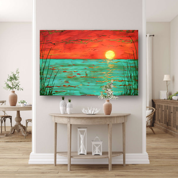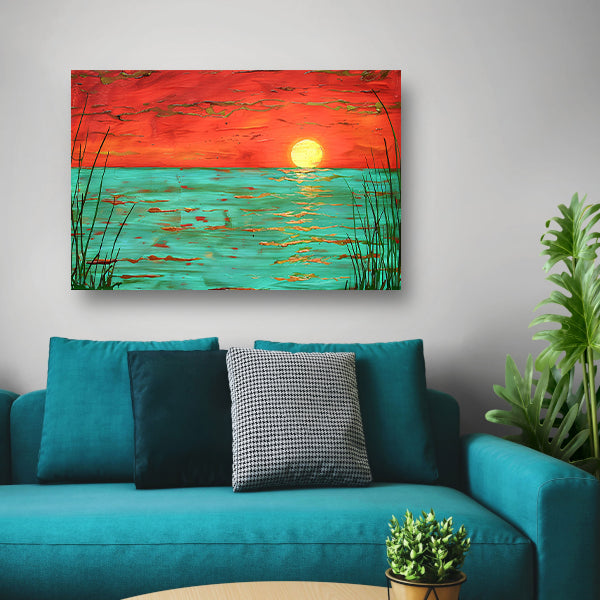 Kleurrijke zonsondergang boven kalm water schilderij acrylglas