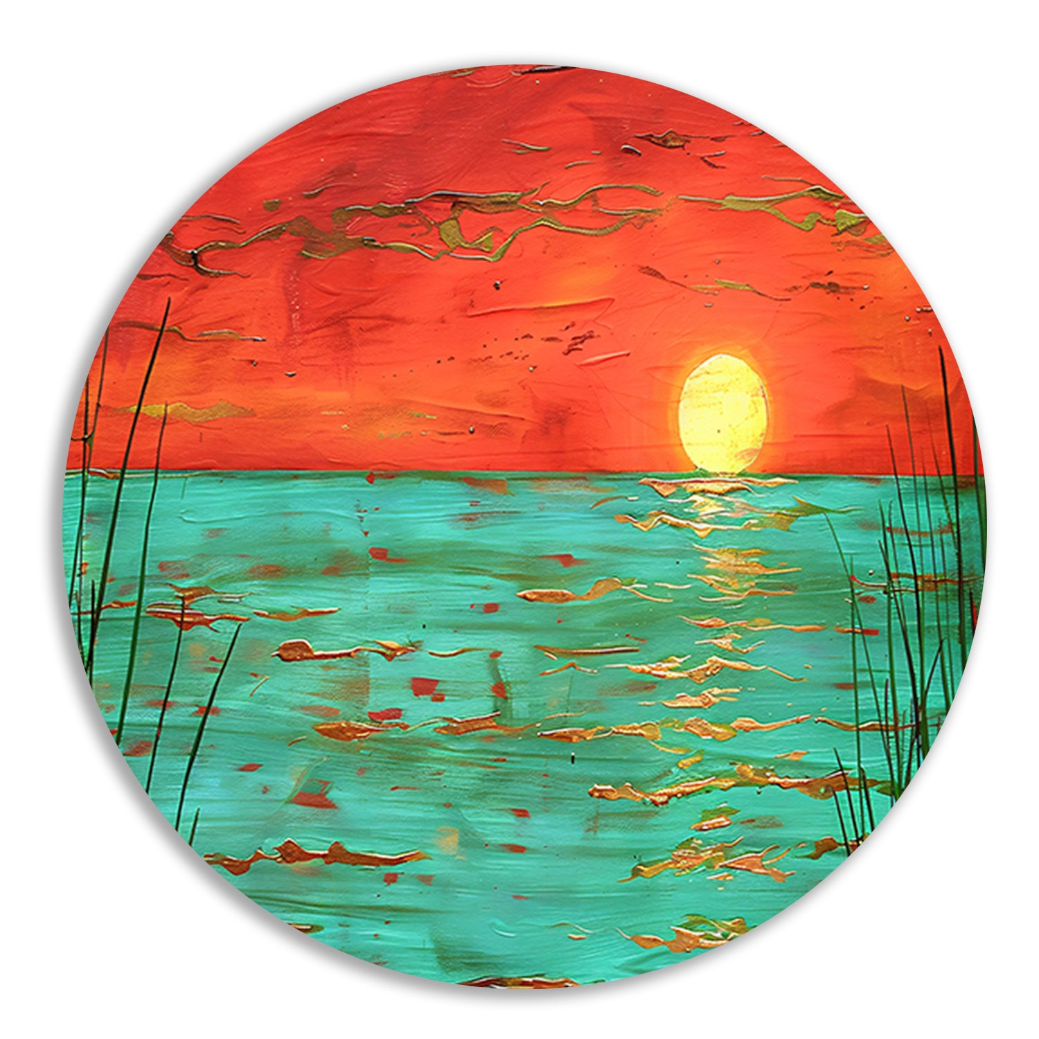 Kleurrijke zonsondergang boven kalm water schilderij aluminium muurcirkel
