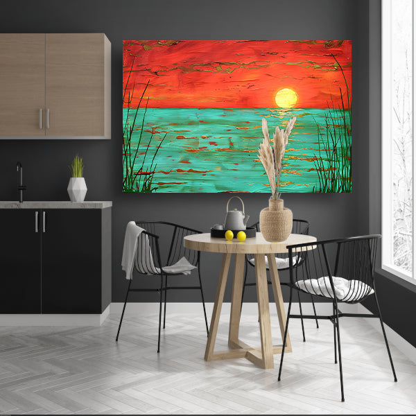 Kleurrijke zonsondergang boven kalm water schilderij canvas met baklijst