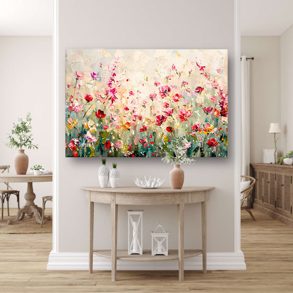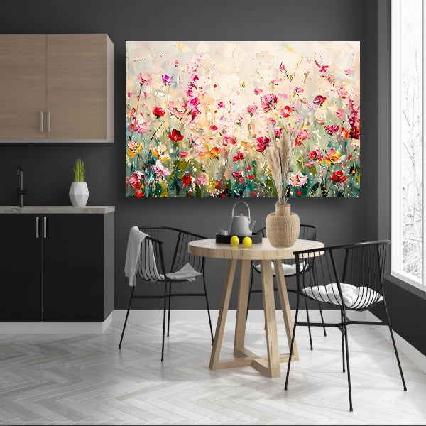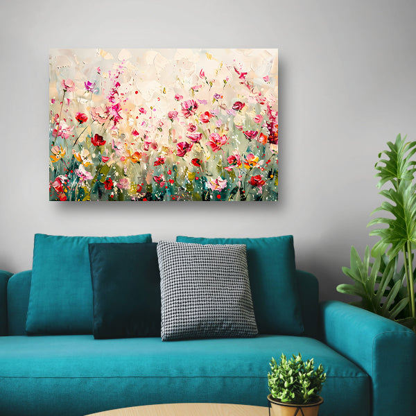 Kleurvol schilderij van een bloemenveld poster