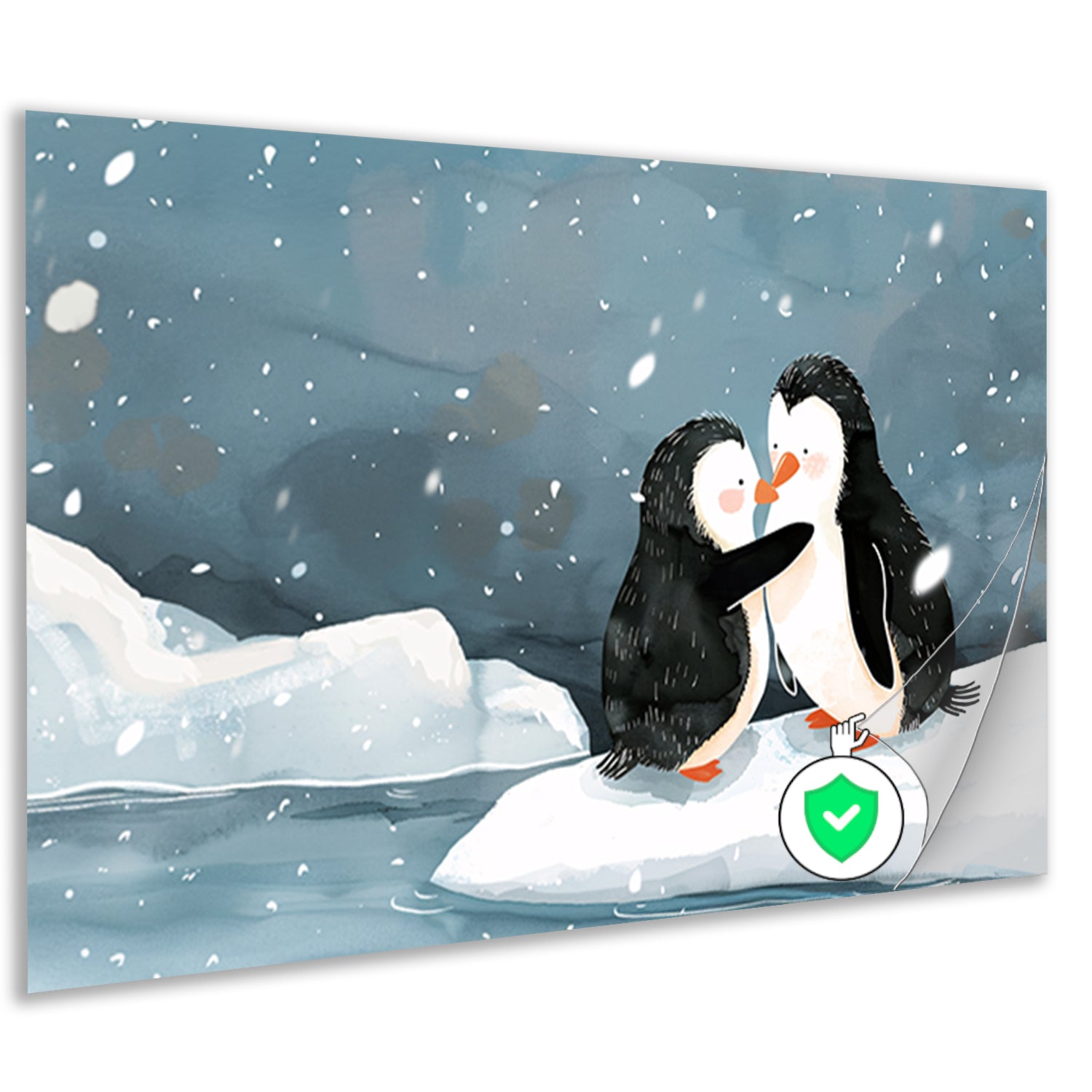 Knuffelende pinguïns in een winterse sneeuwbui poster