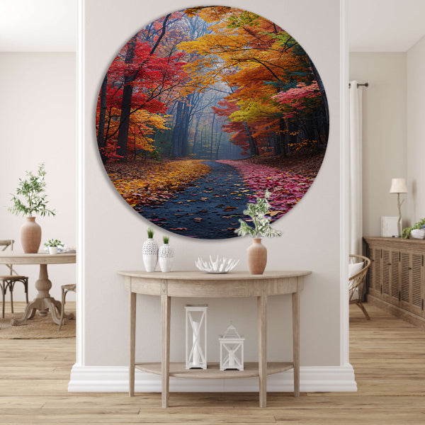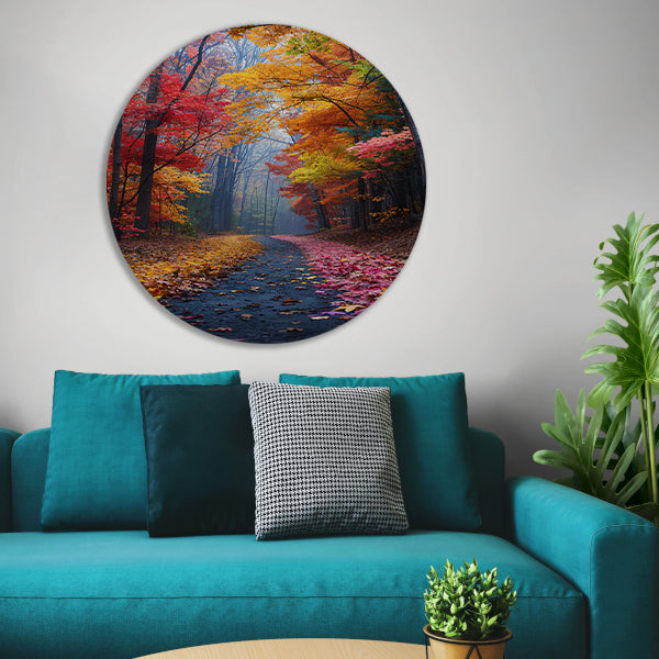 Kronkelend Bospad in Herfstkleuren aluminium muurcirkel