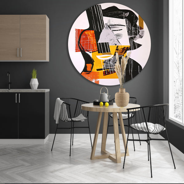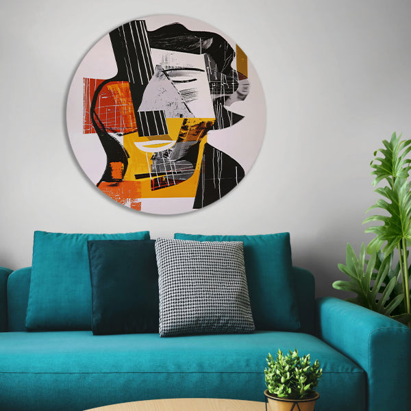Breng een vleugje kunst en kleur in je leven met deze unieke kubistische gitarist muurcirkel en geniet elke dag van een prachtig kunstwerk aan je muur.