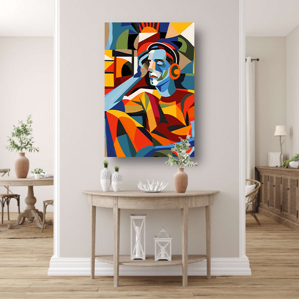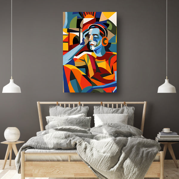 Kubistische man met koptelefoon in abstracte wereld canvas