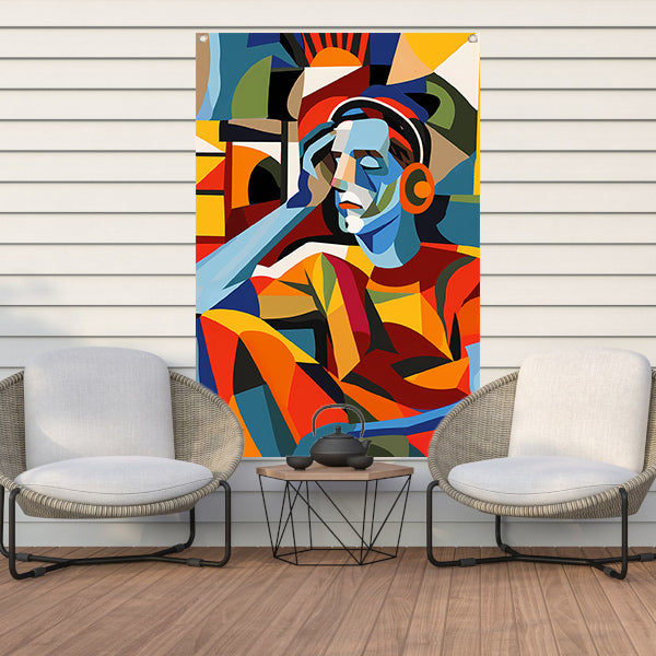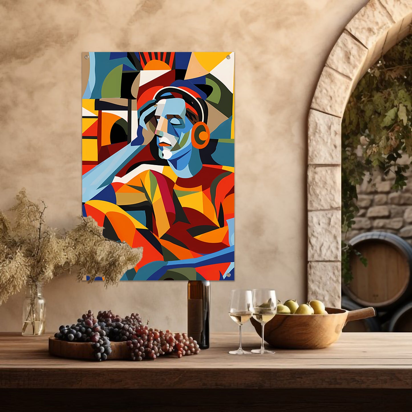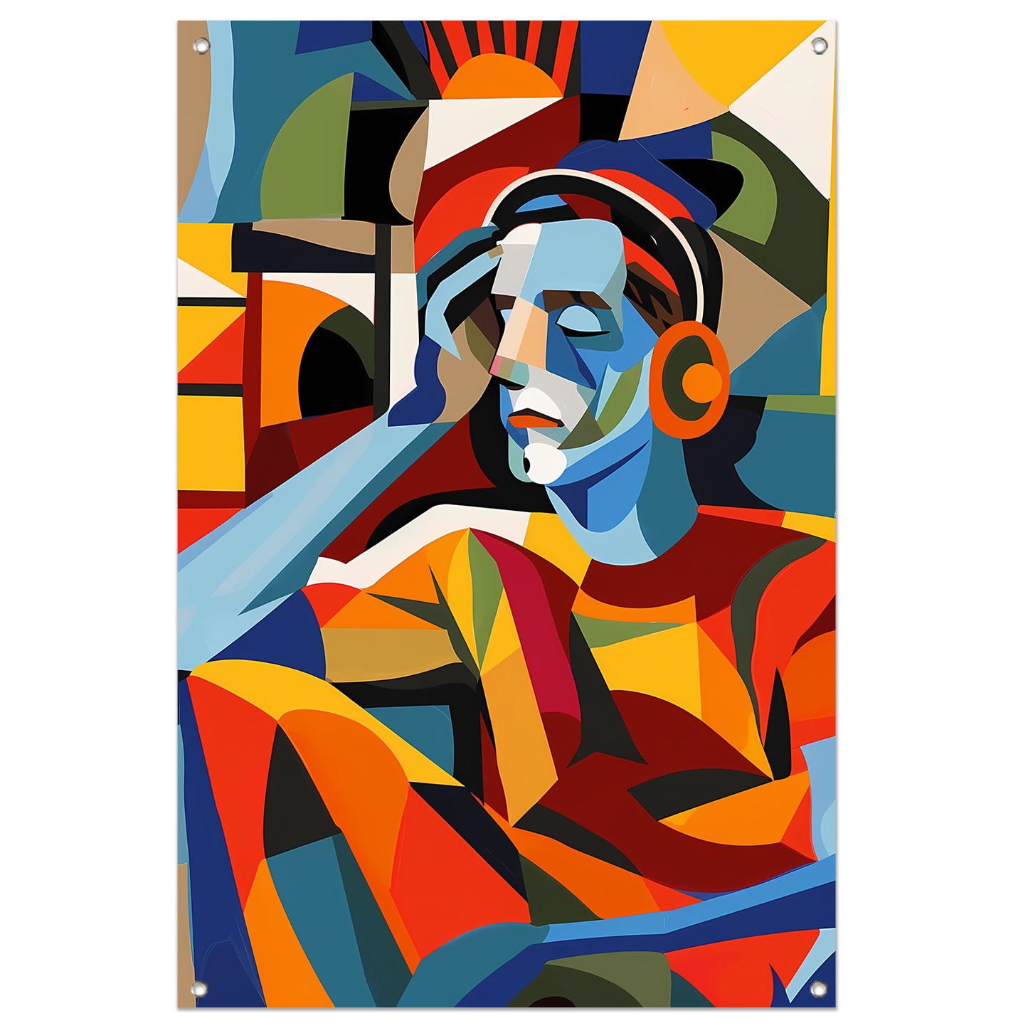 Kubistische man met koptelefoon in abstracte wereld tuinposter