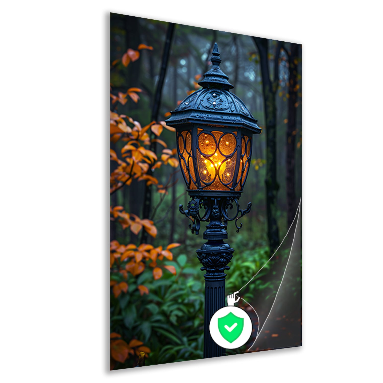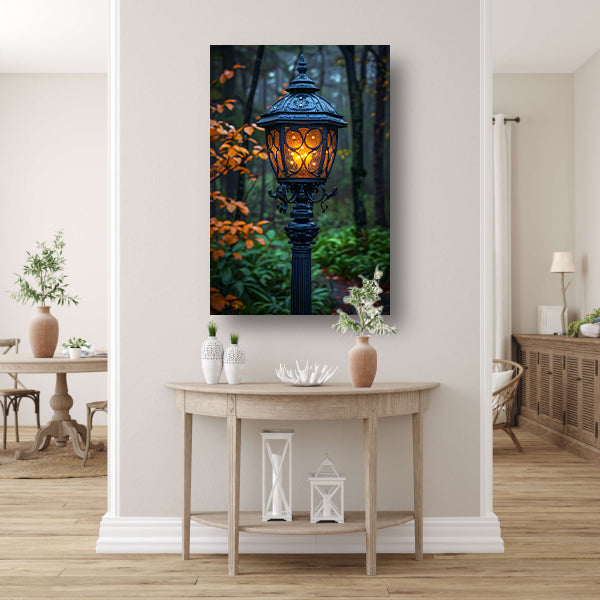 Lantaarnpaal in een mistig bos poster
