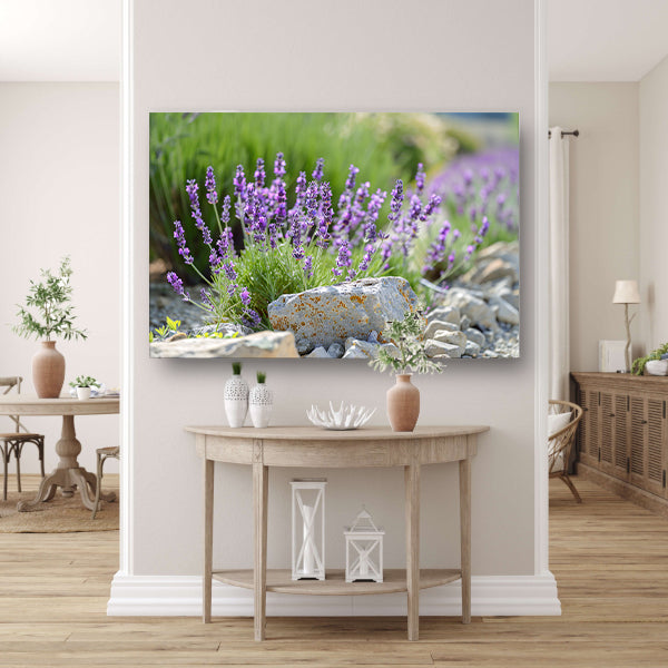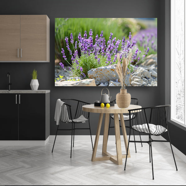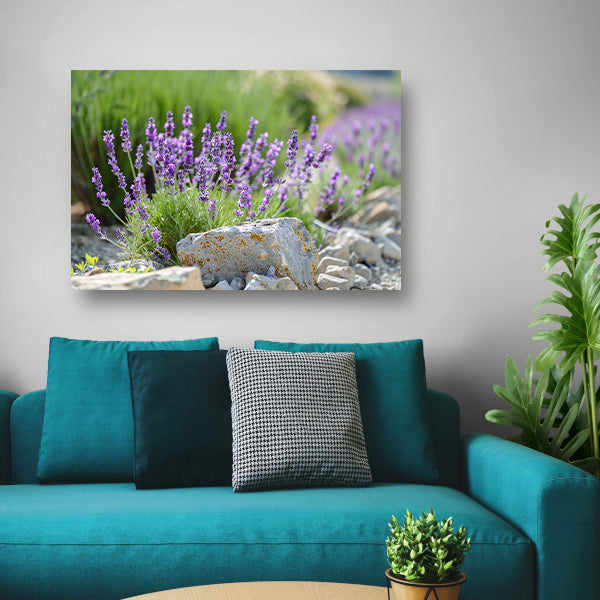 Lavendelbloemen in bloei naast grijsbruine rotsen poster