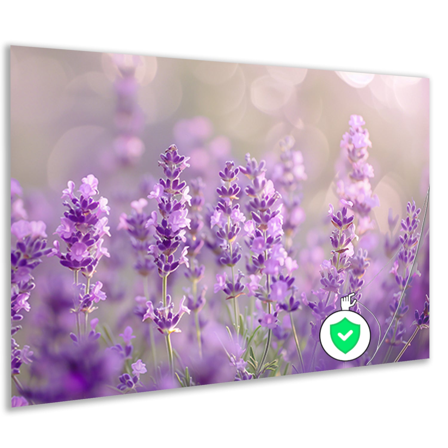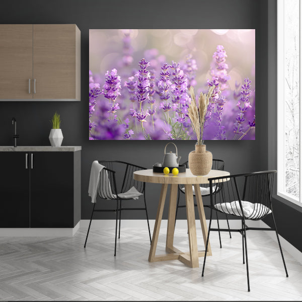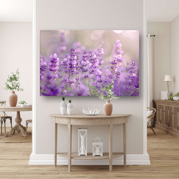 Lavendelveld in bloei met zachte zonlichtgloed poster