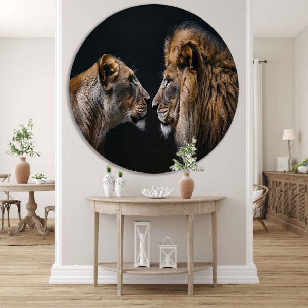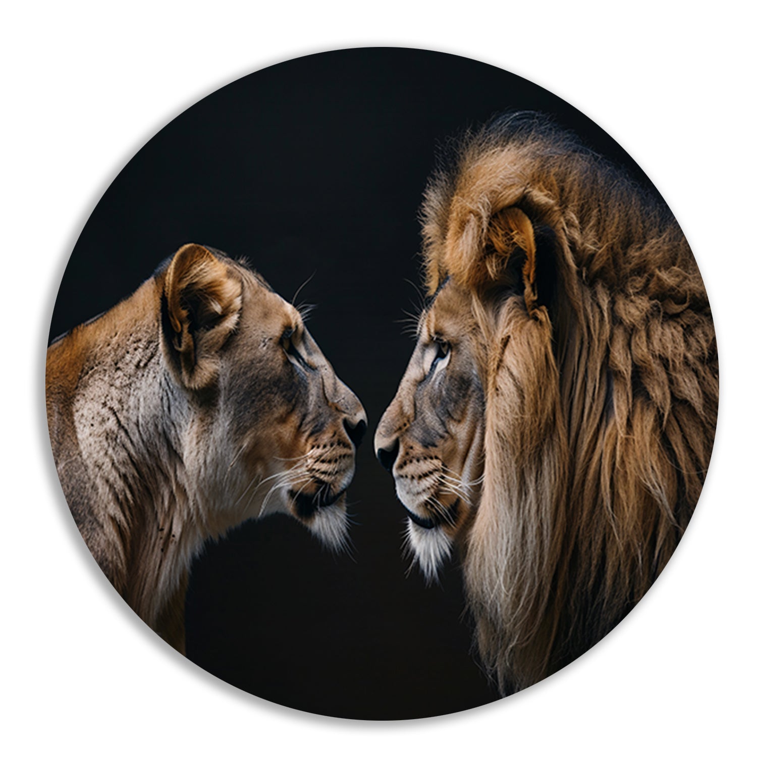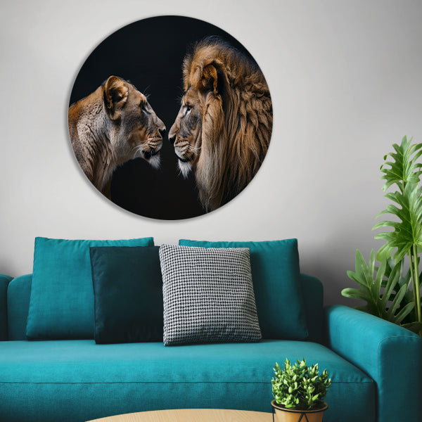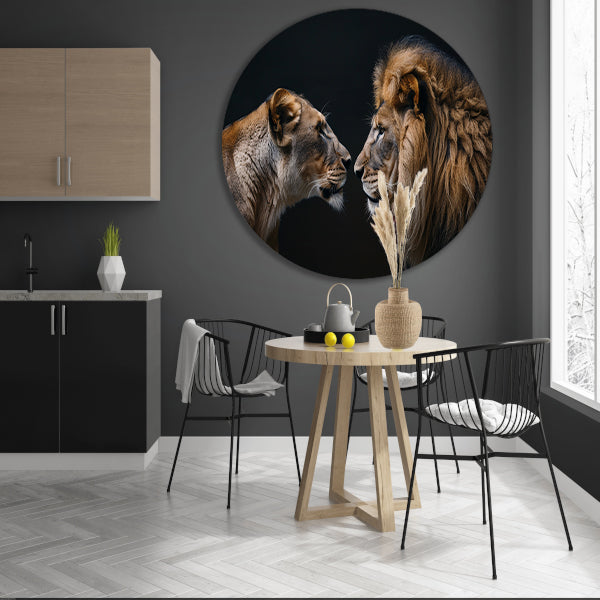 Leeuw en leeuwin in intense ontmoeting aluminium muurcirkel