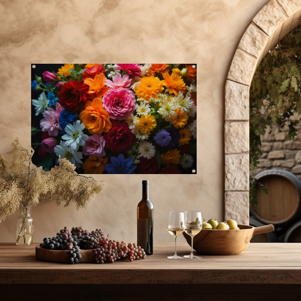 Levendige Bloemendiversiteit op Donkere Achtergrond tuinposter