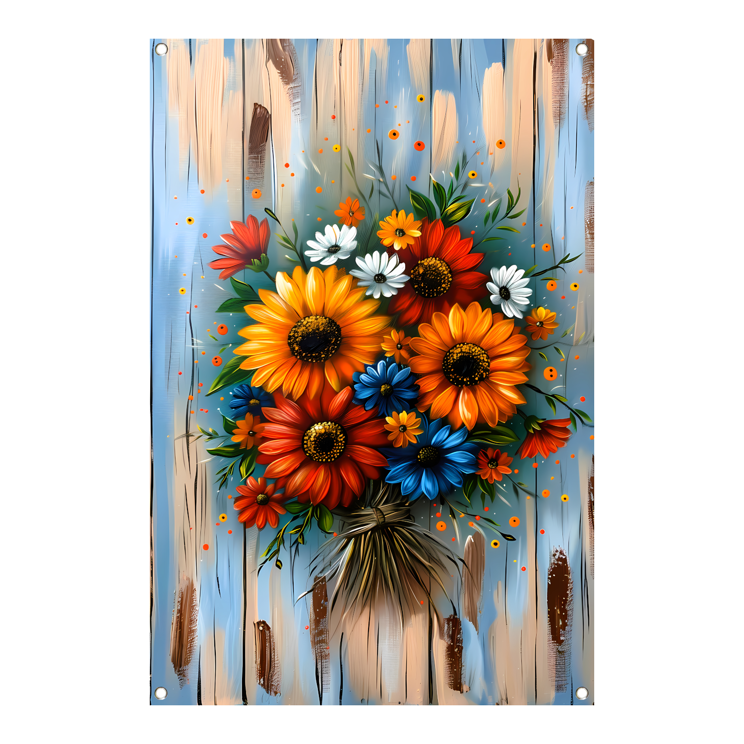 Levendige en kleurrijke bloemen op blauwe achtergrond tuinposter