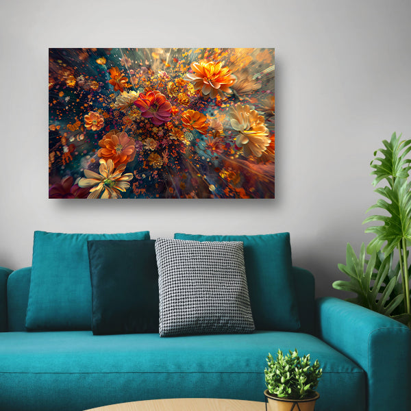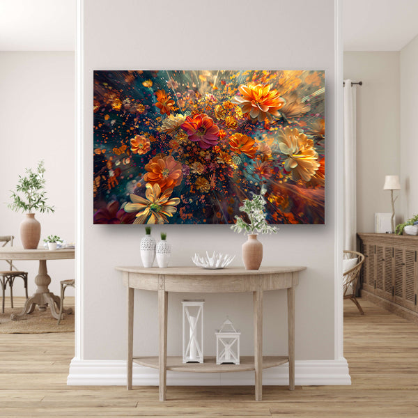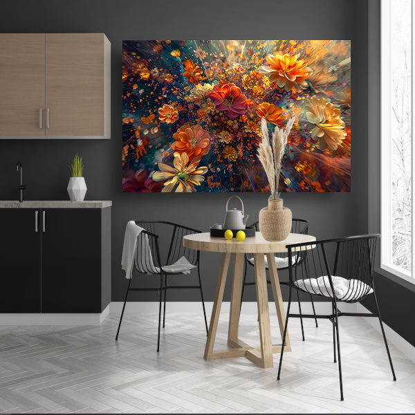 De bloemen komen tot leven in een explosie van levendige kleuren, waarbij elke bloem is weergegeven met oog voor detail en artistieke flair. De combinatie van deze schitterende kleurrijke bloemen zorgt voor een fris en vrolijk effect dat perfect past bij iedere stijl van inrichting, van modern tot klassiek.
