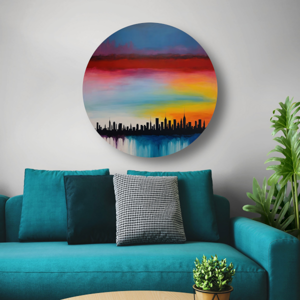 Levendige stedelijke zonsondergang in kleur aluminium muurcirkel