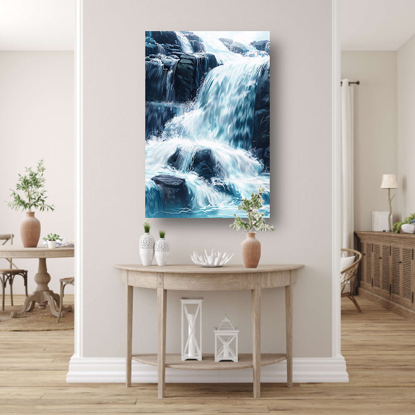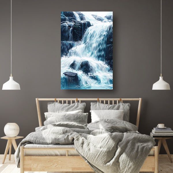 Levendige waterval schilderij met blauwe en groene tinten canvas