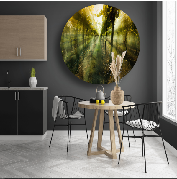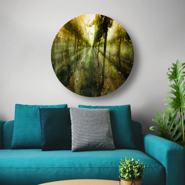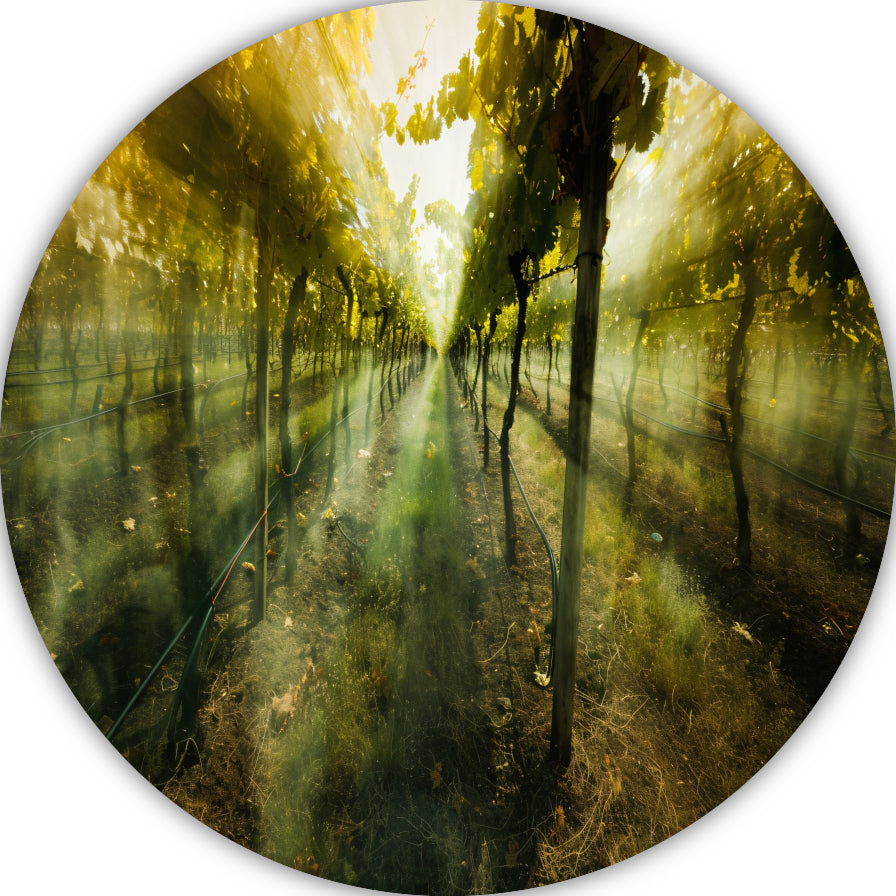 Lichtspel in de ochtendwijngaard aluminium muurcirkel