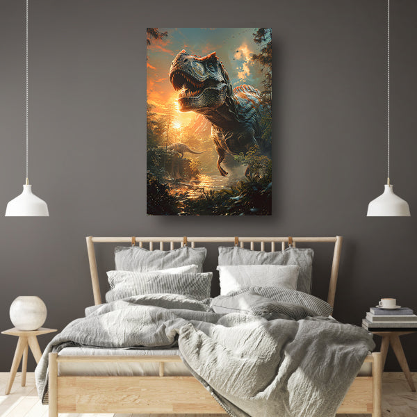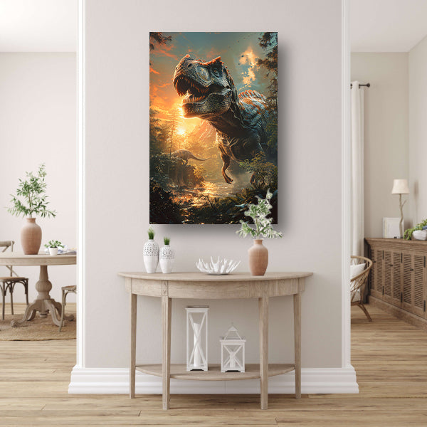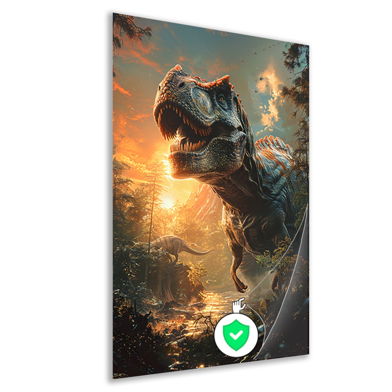 Machtige Tyrannosaurus Rex in zonsondergang poster