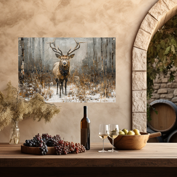 Majestueus hert in besneeuwd boslandschap tuinposter