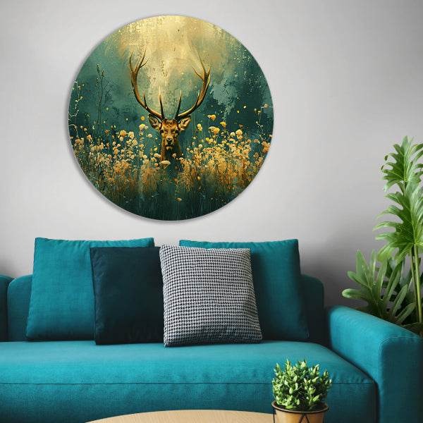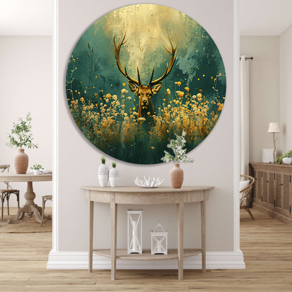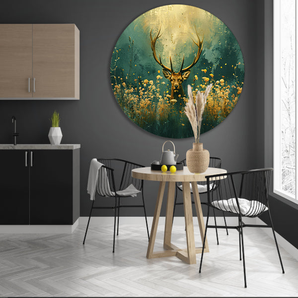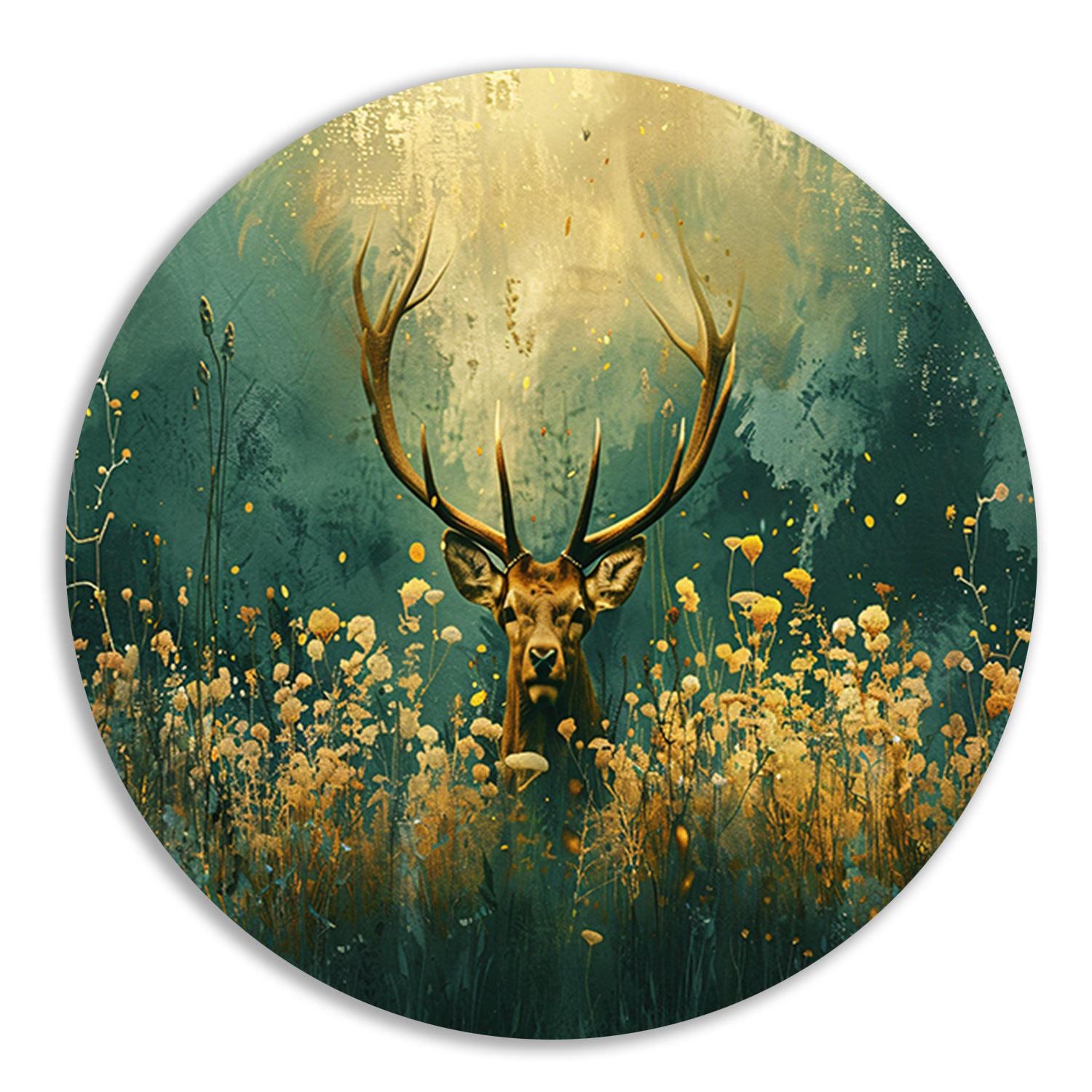 Majestueus hert in bloemenrijk veld aluminium muurcirkel