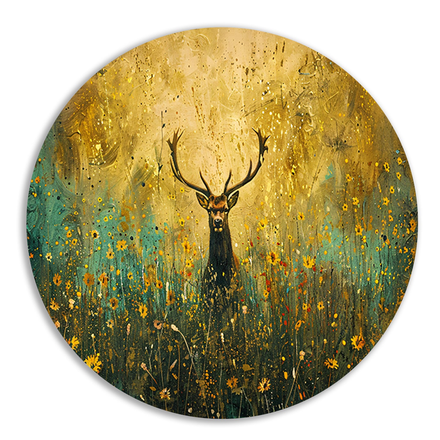Breng de schoonheid van de natuur in huis met dit majestueuze hert in kleurrijk bloemenveld schilderij op aluminium muurcirkel en geniet elke dag van een stukje natuur aan de muur.