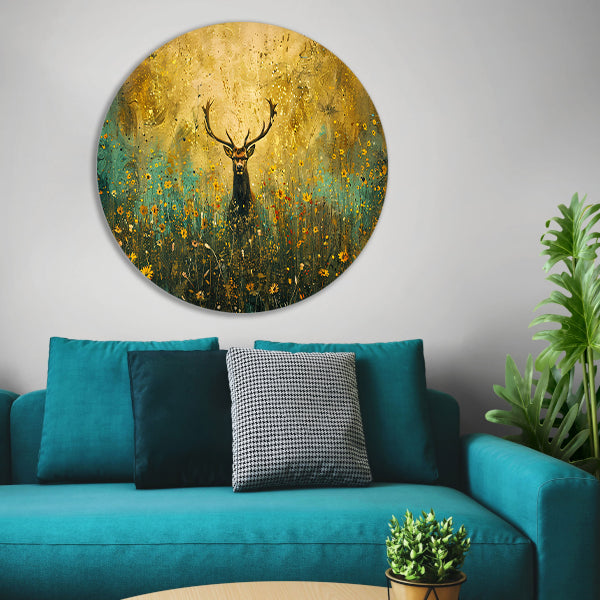 Het levendige kleurenpalet van het bloemenveld creëert een harmonieus contrast met het elegante hert, waardoor dit kunstwerk een echte eyecatcher is in elke kamer. De ronde vorm van de muurcirkel voegt een speels element toe aan het geheel en maakt het een perfecte aanvulling op zowel moderne als klassieke interieurs.