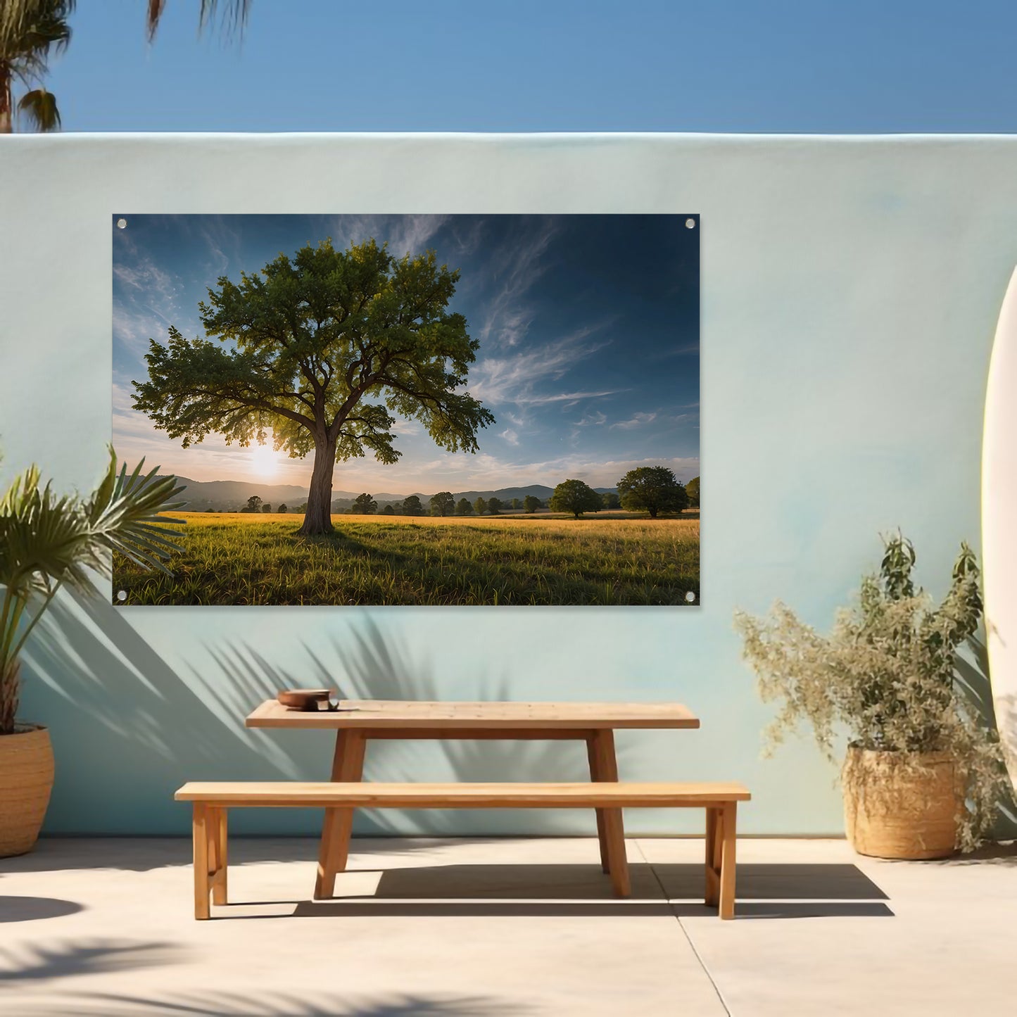 Majestueuze boom bij zonsondergang in veld tuinposter