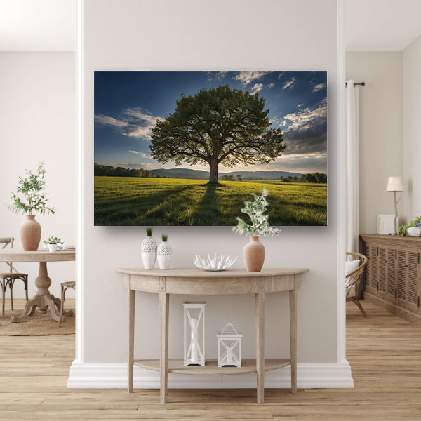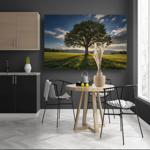 Majestueuze boom in uitgestrekt landschap canvas met baklijst