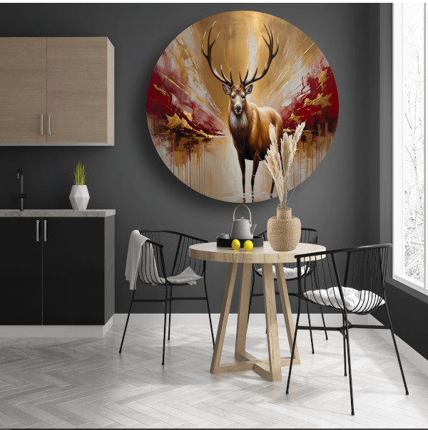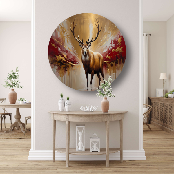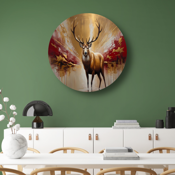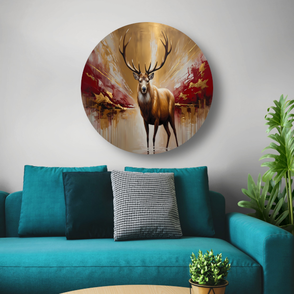 Majestueuze Gouden Hert in Abstract Rood aluminium muurcirkel