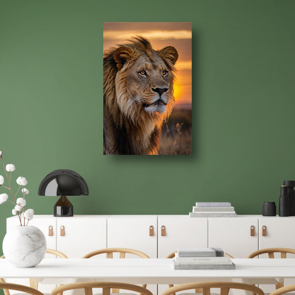 Majestueuze leeuw bij zonsondergang canvas met baklijst