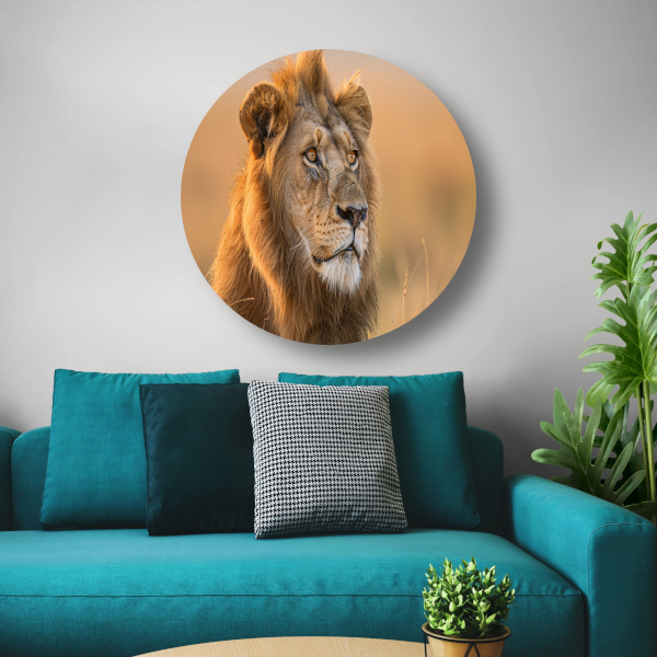 Majestueuze Leeuw in Gouden Avondlicht aluminium muurcirkel