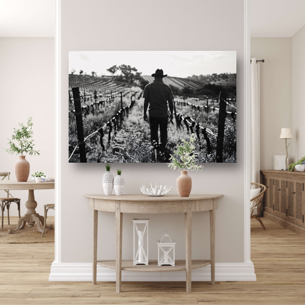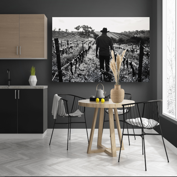 Met deze prachtige wanddecoratie haal je de sfeer van een zonnige wijngaard in huis en creëer je een rustgevende en ontspannen ambiance. Het is een perfecte toevoeging aan elke woonruimte of kantoor en zal zeker bewonderende blikken van gasten oogsten. Geniet elke dag van de schoonheid van de natuur met deze unieke wanddecoratie van een man die door een zonovergoten wijngaard wandelt.