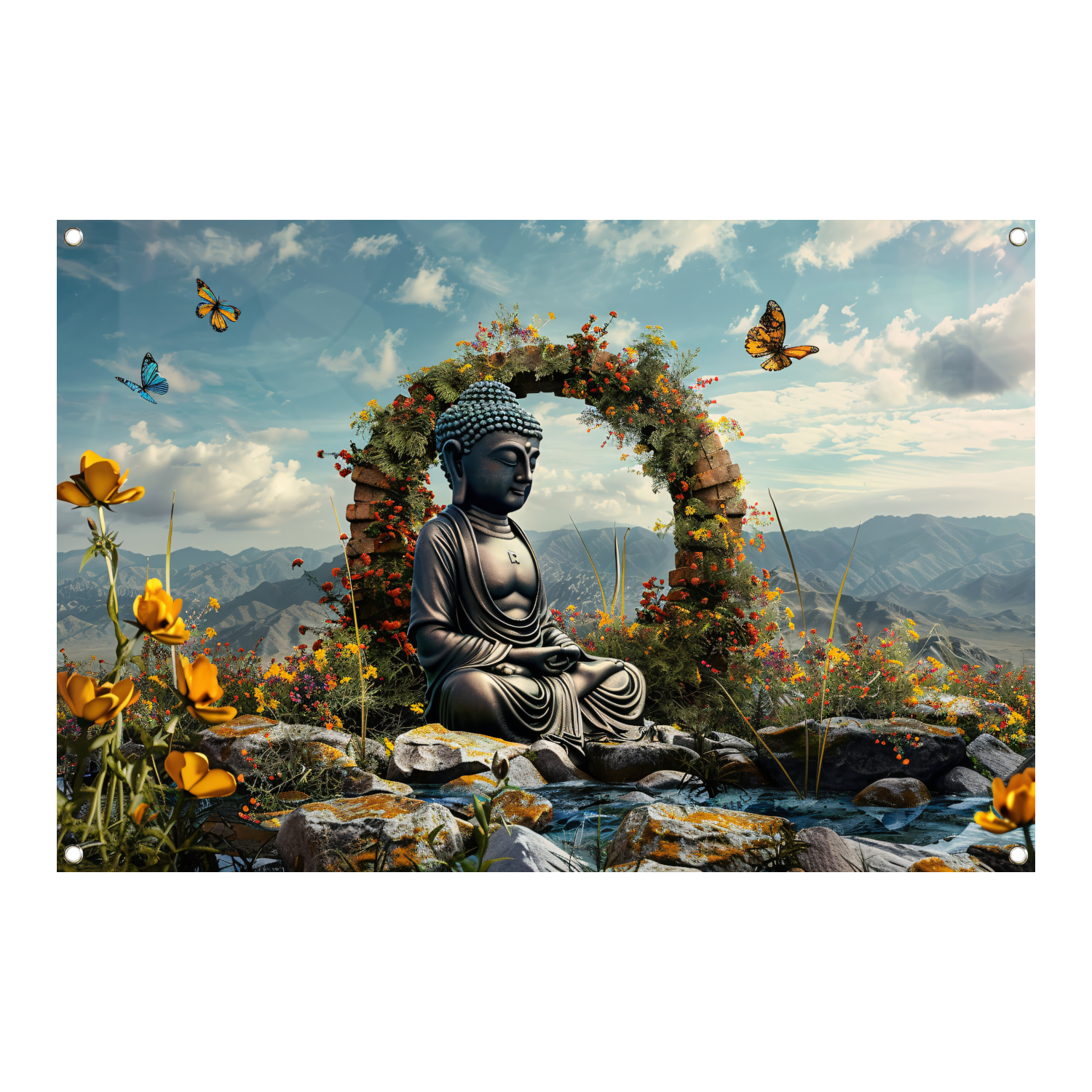 Voeg een vleugje rust en schoonheid toe aan uw tuin met deze Meditatieve Boeddha Temidden van Bloemenpracht tuinposter. Bestel nu en geniet van een serene sfeer in uw buitenruimte.