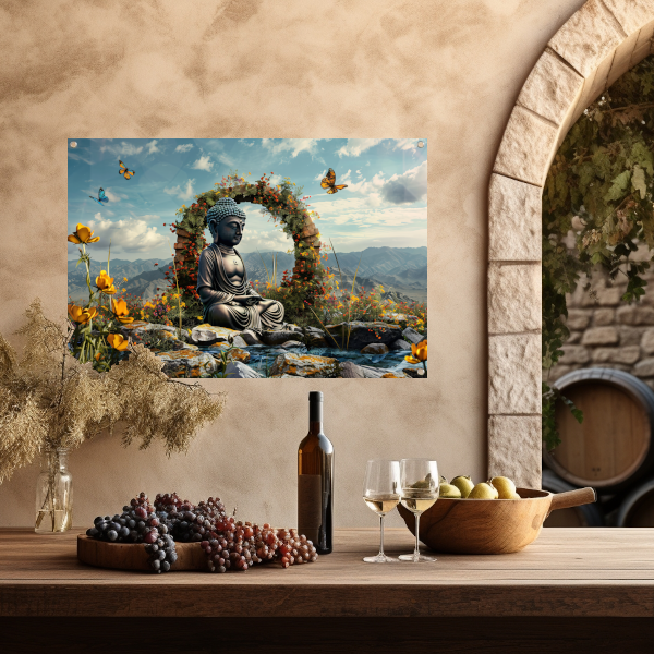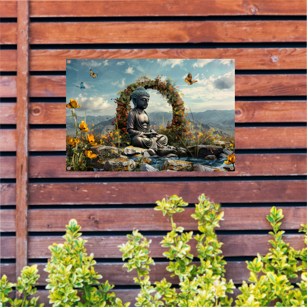 Deze prachtige tuinposter is een perfecte toevoeging aan elke tuin of buitenruimte. Het thema van deze poster is de meditatieve Boeddha, omringd door een weelderige bloemenpracht. Dit zorgt voor een rustgevende en serene sfeer in uw tuin.
