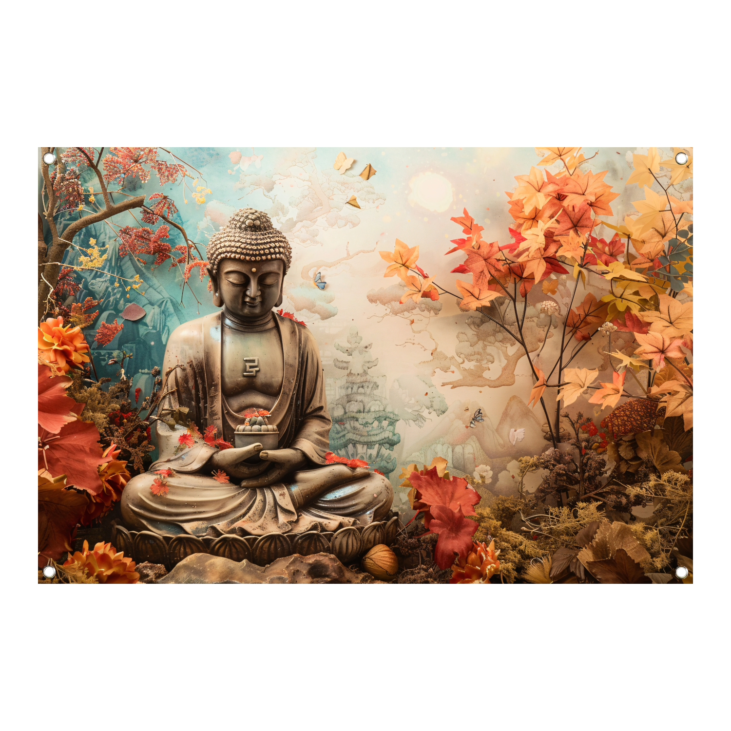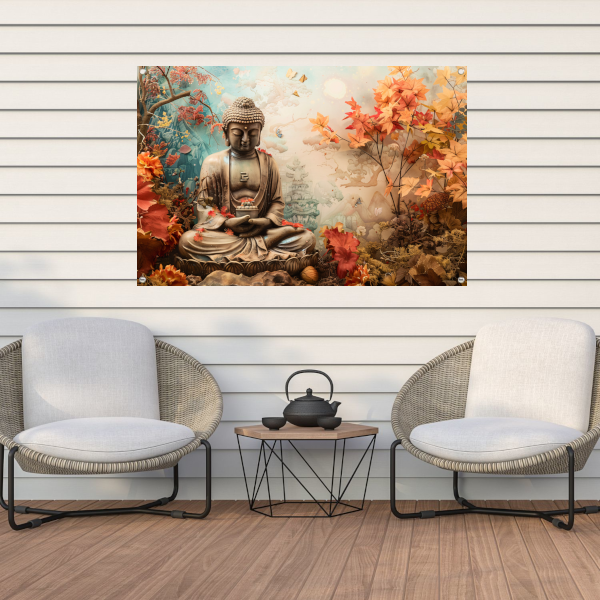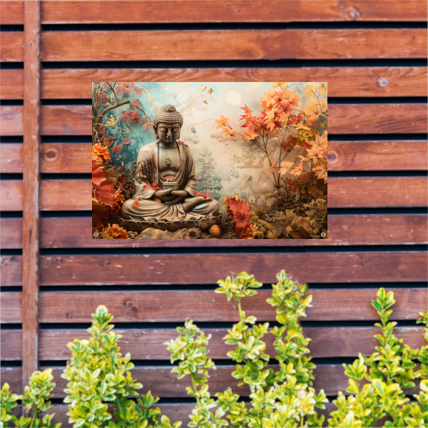 Het thema van deze tuinposter is geïnspireerd op de serene en meditatieve sfeer van de herfst. De afbeelding van de Boeddha tussen de prachtige herfstbladeren brengt een gevoel van rust en balans in je tuin. De warme kleuren van de bladeren en de Boeddha zorgen voor een harmonieus geheel.