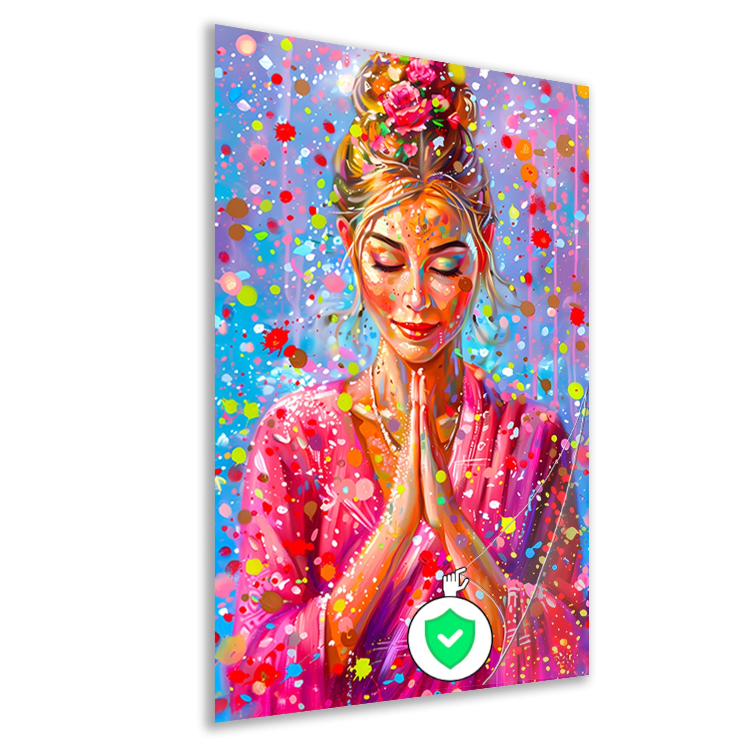 Mediterende vrouw omringd door kleurrijke abstractie poster