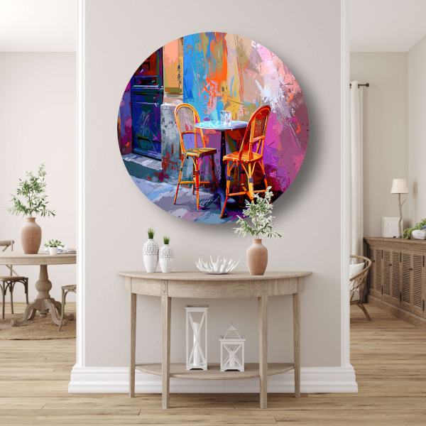Minimalistisch interieur met twee stoelen en tafel aluminium muurcirkel
