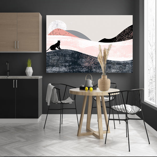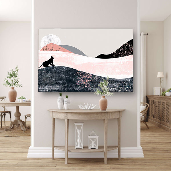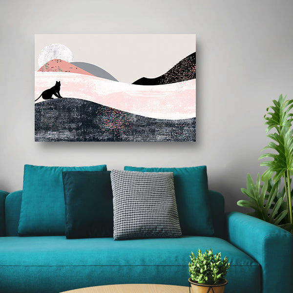 Minimalistisch kunstwerk van kat in abstract landschap canvas met baklijst