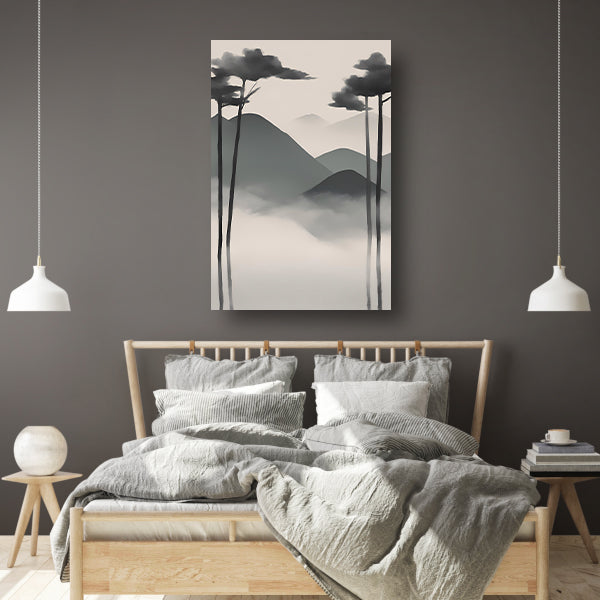 Minimalistisch landschap met mistige bergen canvas met baklijst