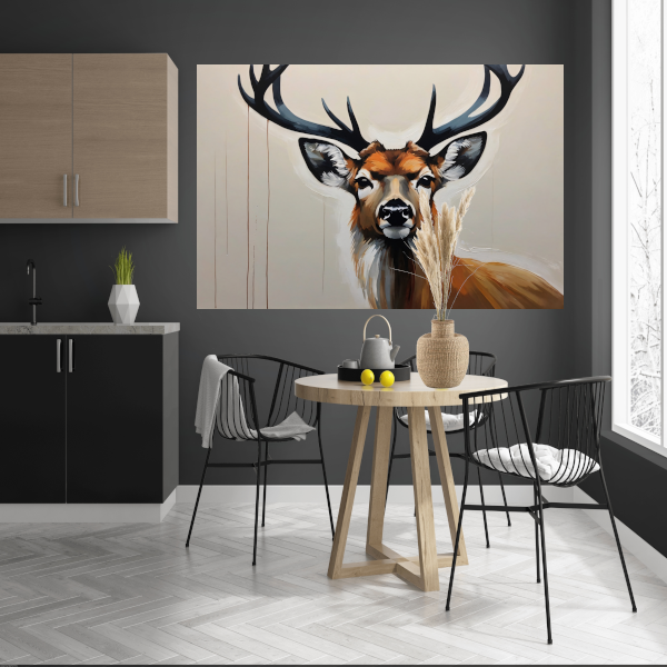 Dit minimalistische portret van een majestueus hert is verkrijgbaar in diverse formaten, zodat u de perfecte grootte kunt kiezen die past bij uw ruimte. Voeg dit elegante en sfeervolle kunstwerk toe aan uw interieur en geniet van de rustgevende uitstraling die het met zich meebrengt.