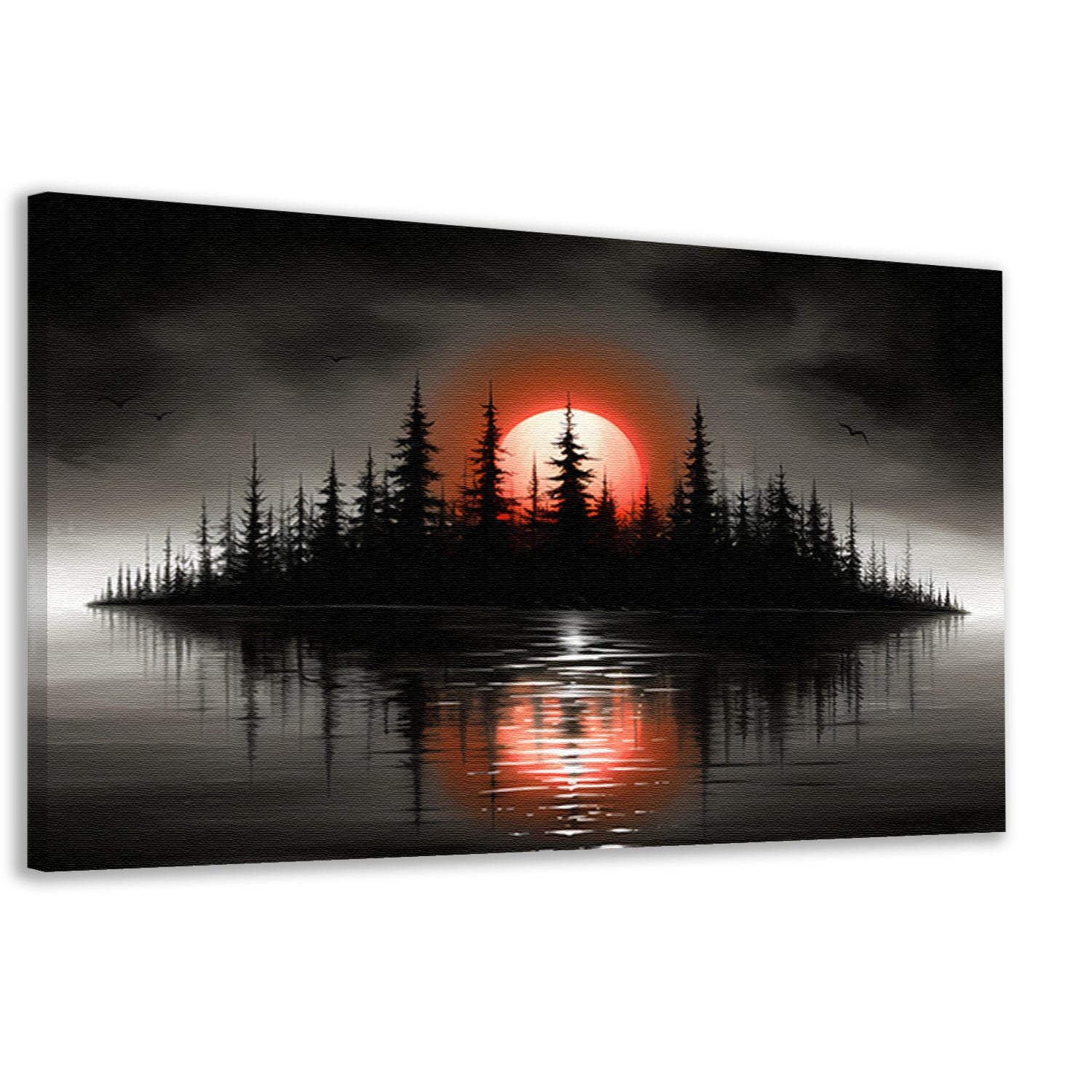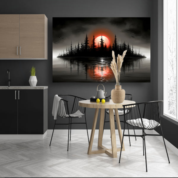 Dit schilderij toont een adembenemende zonsopgang achter een stil eiland, waarbij de silhouetten op een minimalistische manier worden weergegeven. De zachte kleurovergangen en eenvoud van het ontwerp zorgen ervoor dat dit kunstwerk zich moeiteloos aanpast aan diverse interieurstijlen, of het nu modern, Scandinavisch of landelijk is.
