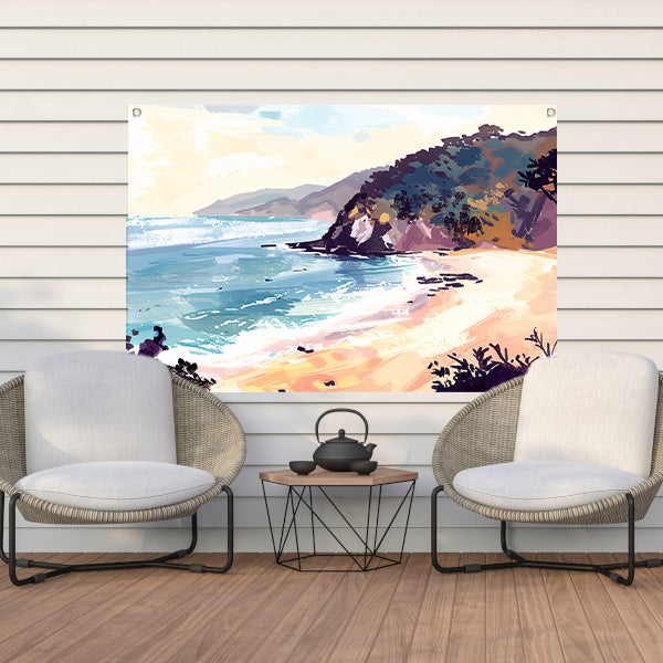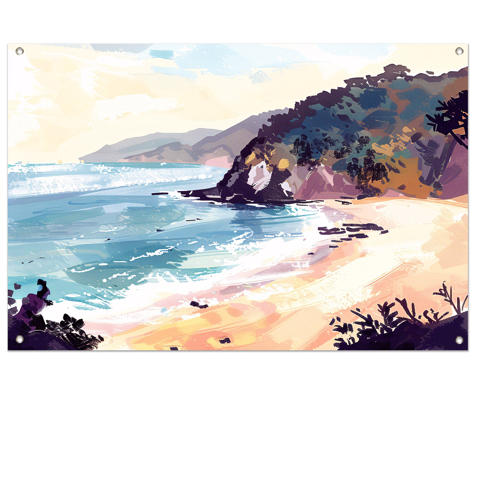 Minimalistisch schilderij van strand bij zonsopgang tuinposter