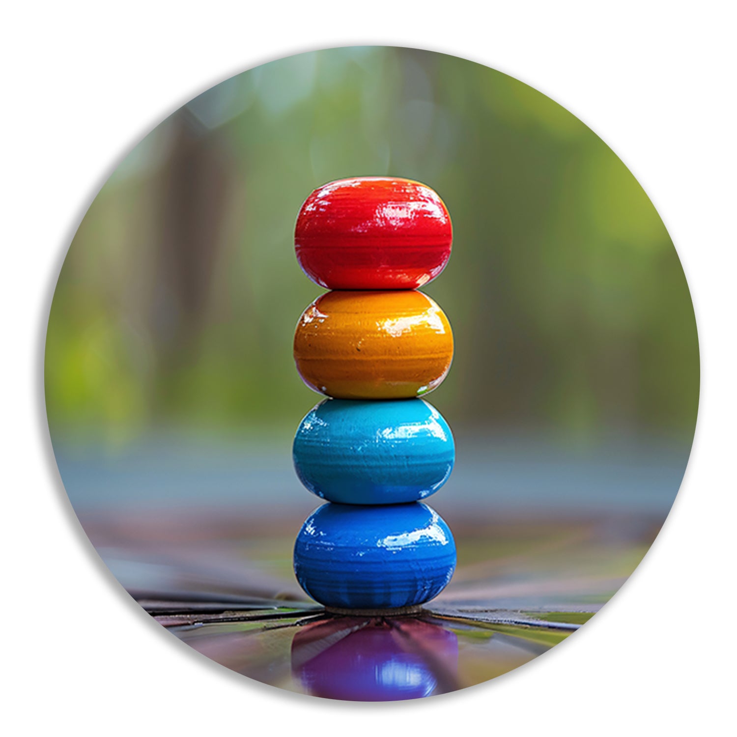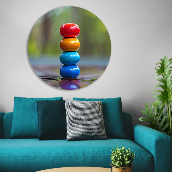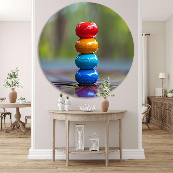 De minimalistische stenen stapeling op de muurcirkel zorgt voor een rustgevende en moderne uitstraling in elke ruimte. Of je nu een minimalistisch interieur hebt of juist op zoek bent naar een eyecatcher, deze muurcirkel past perfect in elke setting.