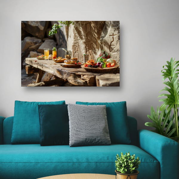 De combinatie van het minimalistische design en de levendige kleuren maken dit stilleven met eten een unieke toevoeging aan jouw interieur. Of je nu een liefhebber bent van moderne kunst of gewoon op zoek bent naar een origineel accent voor jouw interieur, dit kunstwerk past in vrijwel iedere woonstijl.
