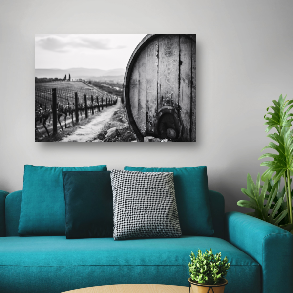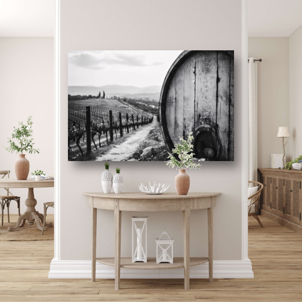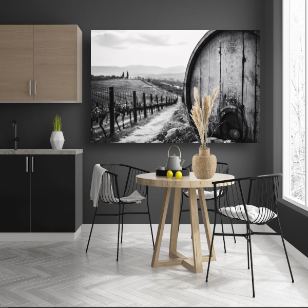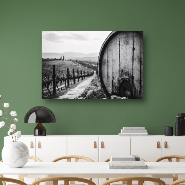 Dankzij de gratis meegeleverde ophangplaat kun je het stilleven eenvoudig aan de muur bevestigen, waardoor het een echte eyecatcher wordt in je interieur. Of je nu een liefhebber bent van wijn of gewoon op zoek bent naar een uniek kunstwerk, dit minimalistische wijnvat stilleven zal zeker indruk maken op iedereen die het ziet.