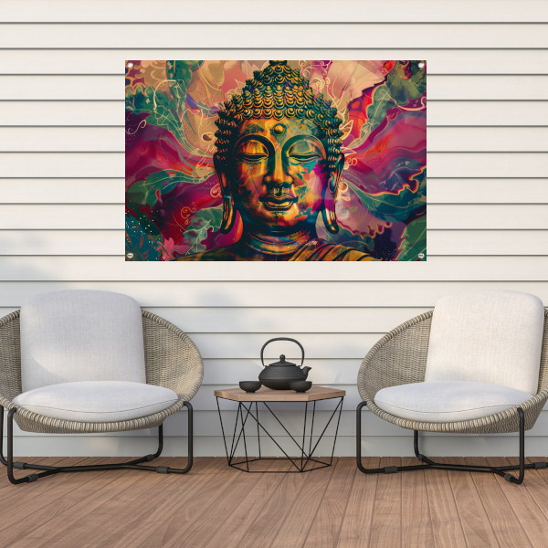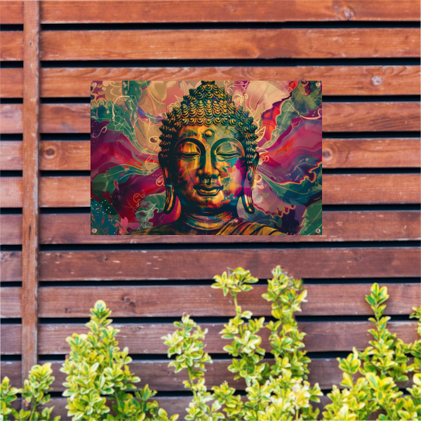 De kleuren van de poster zijn subtiel en passen goed bij elke tuin. Het zwart-witte lijntekeningontwerp zorgt voor een minimalistische en moderne uitstraling. Het thema van Boeddha brengt een gevoel van rust en sereniteit in uw buitenruimte.
