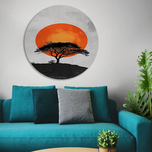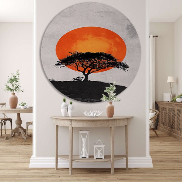 Minimalistische boom en zon in krachtige contrasten forex muurcirkel