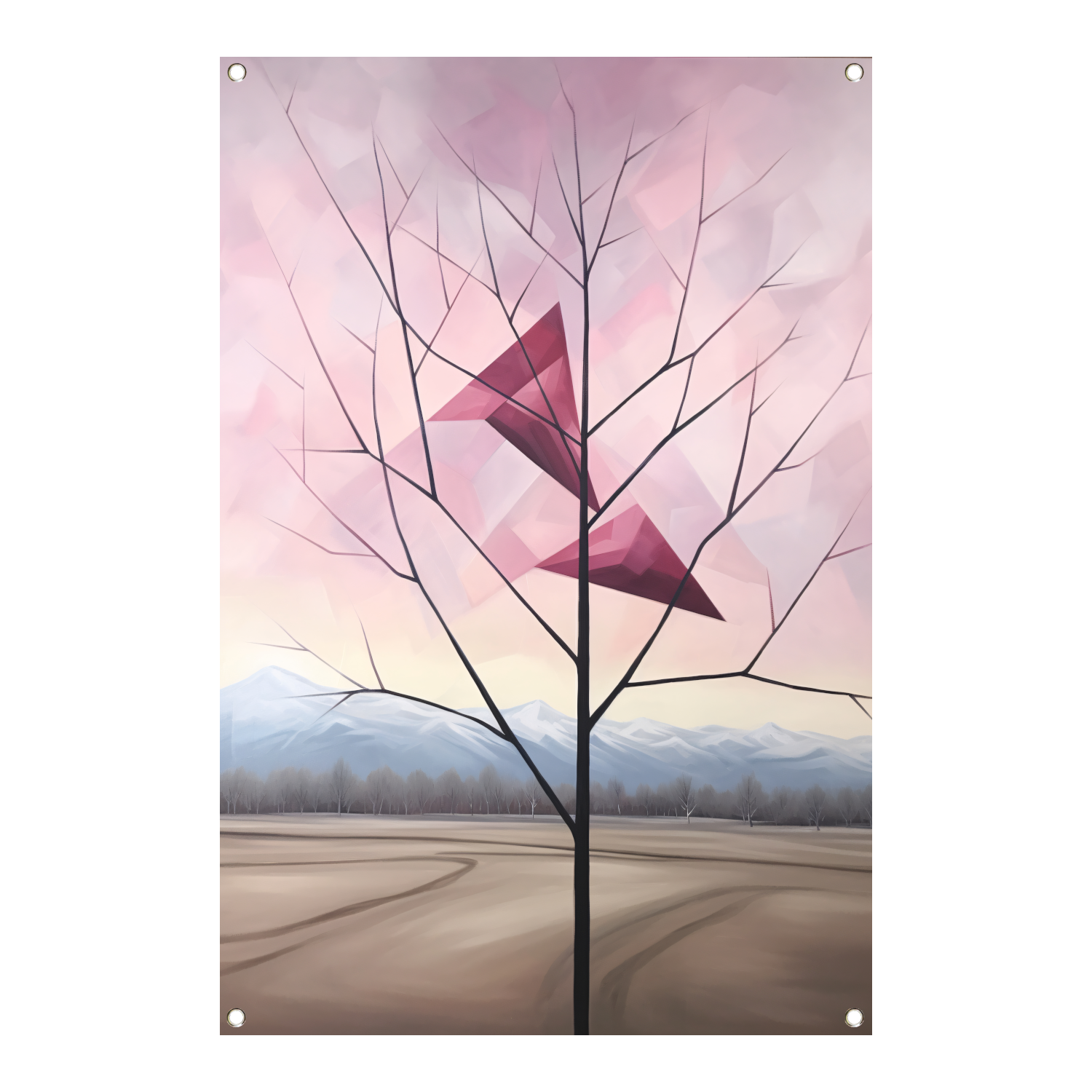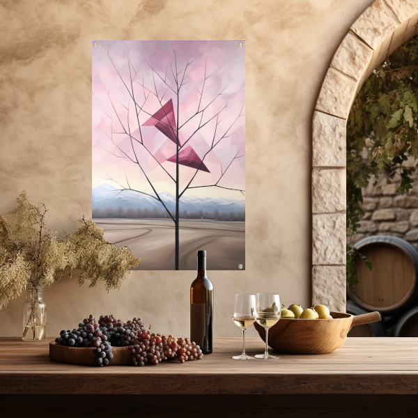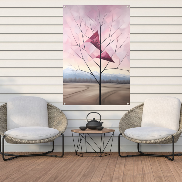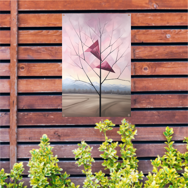 Het thema van deze tuinposter is natuur en rust. De eenvoudige lijnen en kleuren van de boom en bergen geven een minimalistische uitstraling, waardoor de poster perfect past in elke tuin. De kleuren zijn zacht en natuurlijk, waardoor de poster een harmonieus geheel vormt met de omgeving.