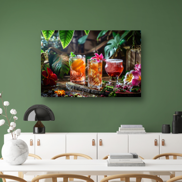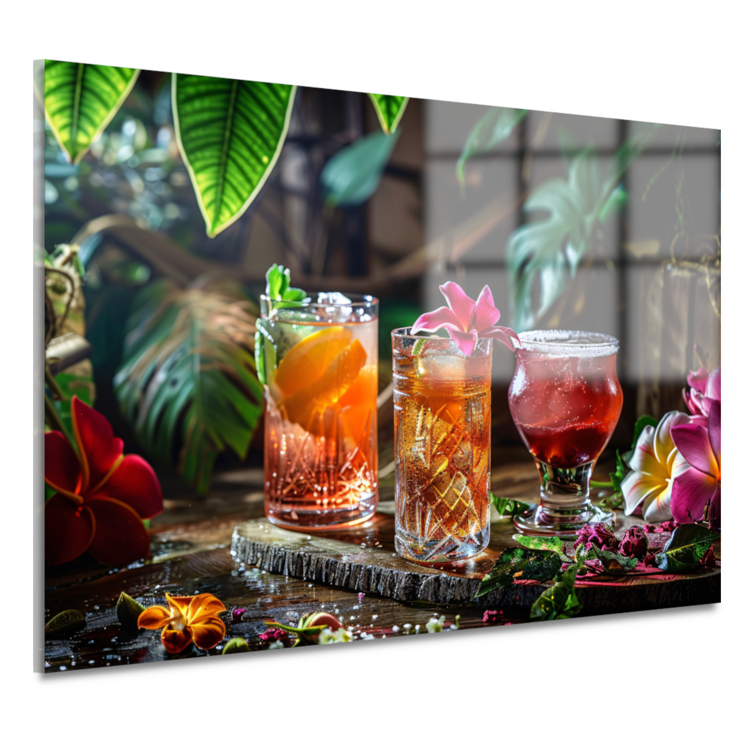 Het acrylglas zorgt voor een heldere en glanzende uitstraling van de compositie, waardoor de kleuren van de drankjes tot hun recht komen. Het materiaal is duurzaam en lichtgewicht, waardoor het gemakkelijk aan de muur kan worden gehangen met de meegeleverde ophangplaat.