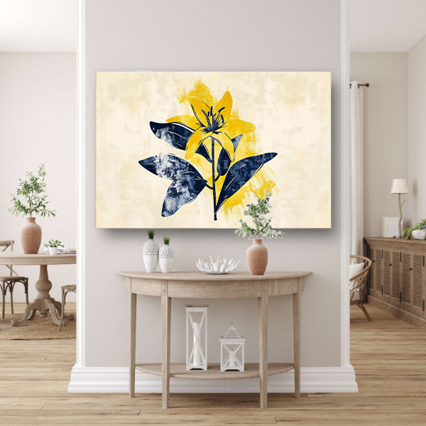 Minimalistische gele bloem met blauwe bladeren canvas met baklijst