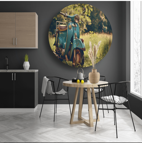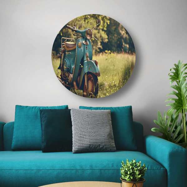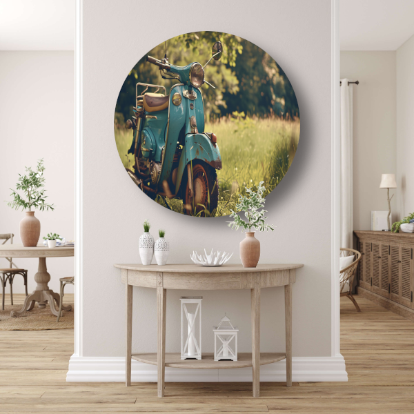 Minimalistische Scooter in Grasveld aluminium muurcirkel