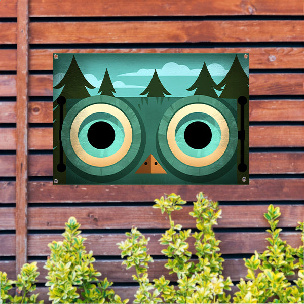 Minimalistische uil met bosachtergrond tuinposter